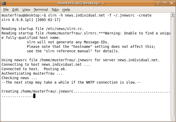 This will start slrn and open a connection to our news server. At first a data file ".jnewsrc" is created. If you did not enter your account details in the previous step slrn will ask for them now.